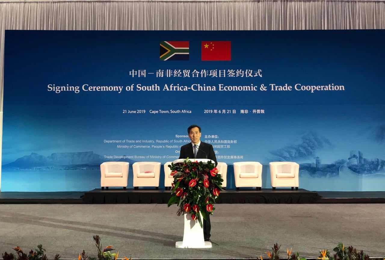 6月21日,中南经贸合作项目签约仪式在南非开普敦举行,来自近40家中国大型企业的70余名企业家与南非60家企业达成93份协议,总额达20亿美元,涵盖苜蓿草、牛肉、羊毛、水产品、水果、纸浆、铜、镍等商品贸易和汽车投资等领域,中南政商界人士、在南中资企业代表、媒体记者500余人参加活动。