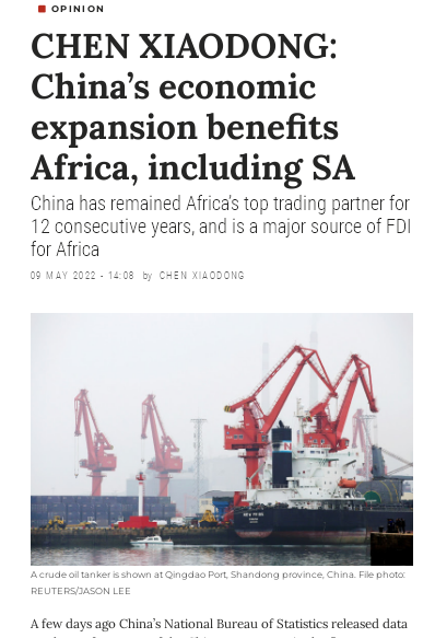 2022年5月9日,南非影响力最大的经济类网站商业在线网刊登驻南非大使陈晓东题为《中国经济行稳致远 持续助力非洲复苏》的署名文章,全文如下:
